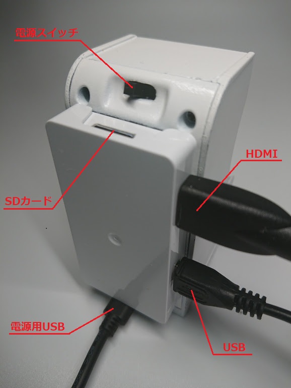 筐体を壁につけることを想定してRaspberry Pi Zero側の電源用USBも使えるようにはしてあるが、その場合上部の電源スイッチが使用できなくなる。